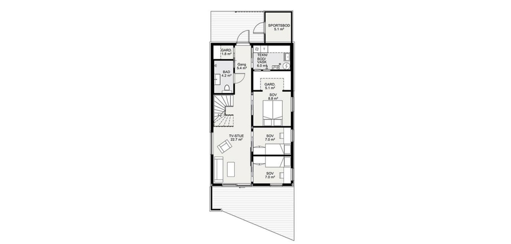 Denne versjonen av Alta har fått et stilig overbygd inngangsparti, med en praktisk sportsbod rett ved inngangsdøren. Der kan man enkelt sette fra seg barnevogn, sparkesykler, akebrett og andre ting en aktiv familie har, men ikke trenger å ha med inn i huset. Når du kommer inn har du garderobe og vaskerom rett innenfor døren. Alle våte klær kan gå rett til tørk og vasking. Du har også et bad i gangen. Det er tre soverom i første etasje, hvorav det største har et romslig walk-in-closet. Det er også en TV-stue i denne etasjen, som har dør ut mot den overbygde plattingen og hagen. På grunn av den ene veggen som går ned fra fasaden her, så får man en lun og skjermet uteplass.